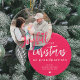 Upload your favorite photo (preferably square), insert your text, names, and date, and make these trendy modern Joyful pink script Christmas tree ornament a keepsake gift to remind grandma and grandpa of their first Christmas as grandparents!