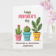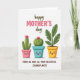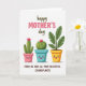 This card features a bright white background with the greeting “happy MOTHER’S day” placed across the top, with “happy” in a flowing style and “MOTHER’S day” in thicker lettering, all in dark text for easy reading. Below, three cute potted plant characters sit in a row, leaning slightly toward each other like close friends sharing a sweet moment ❤️. On the left is a tall, segmented cactus with a small pink flower, sitting in a soft pink pot with a smiling face and rosy cheeks. In the middle is a round cactus with a flower, perched in a calm blue pot with wide, friendly eyes. On the right is a leafy green plant with darker leaves dotted with lighter specks, growing from a sunny yellow pot that also has a cheerful face 🌼. Small shadows under each pot add a little depth while keeping the layout simple and airy. Along the bottom, the line “FROM ME AND ALL YOUR BEAUTIFUL GRANDPLANTS” runs in uppercase lettering, centered beneath the three pots in a dark color. The flower petals are pink and the three pots are colored pink, blue, and yellow from left to right.
