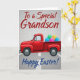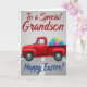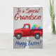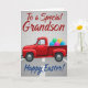 This greeting card features a cherry-red vintage pickup truck shown from the side, with rounded fenders and small metallic highlights that give it a gently cared-for look. Behind it sits a softly textured white brick wall, setting a calm backdrop that lets the red vehicle stand out. In the open truck bed, oversized smooth egg shapes are stacked like a generous gift, in pastel green, sunny yellow, bright blue, and vivid pink, with a sweet, sharing feel 🐰. The eggs’ glossy finish and the even lighting add a polished, springtime glow without looking harsh. Near the top, a flowing red line of text reads “To a Special Grandson,” centered above the truck like a warm note hovering in the air. Along the bottom, “Happy Easter!” appears in deep blue on a light gray roadway, placed low and wide so it balances the truck’s length 🌷. The road is a soft gray strip with a subtle edge line beneath the wheels, grounding the scene against the white brick background.