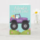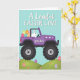 This card shows a purple off-road vehicle with chunky black tires rolling across soft spring-green hills under a clear sky-blue background 🌷. In the driver’s seat, a white long-eared bunny sits upright, and its gentle forward gaze gives the scene a friendly, caring tone 🐰. The open back is piled with colorful patterned eggs in pink, orange, yellow, teal, and purple, like a cheerful delivery meant for someone special. A few smaller decorated eggs dot the grassy slopes, with tiny hearts tucked between them to suggest affection without needing a big gesture. Near the top, the phrase “A Load of EASTER LOVE” is set in white lettering, standing out clearly against the blue sky. The word “grandson” appears in small lettering on the side of the vehicle, placed like a name tag on the door. The rolling landscape is drawn with smooth curves and light shading, keeping the focus on the bunny driver and the egg-filled cargo. The eggs in the back show stripes, dots, and simple patterns, and a couple of tiny hearts sit near the scattered eggs on the hills.