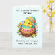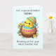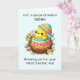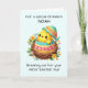 Celebrate your grandson's very first Easter with this adorable and heartfelt card. Featuring a cute baby chick hatching from an egg, surrounded by colorful spring flowers, the soft pastel teal background adds a gentle, cheerful touch. The front of the card can be personalized with his name, marking this milestone occasion in a special way. Inside, a warm message expresses love and joy, wishing him a day filled with sweet moments and fun surprises. This is the perfect way to make his first Easter “egg-star” special and full of happiness.