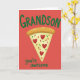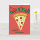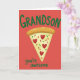 This card shows a single slice of pizza centered on a deep red background, drawn in a simple digital illustration style. The crust is golden brown, and the cheese is a soft pale yellow that looks warm and melty. Instead of pepperoni, there are four red heart shapes on top, shiny and evenly spaced, which makes the whole slice feel sweet and affectionate ❤️. Tiny red and green sprinkle-like dots are scattered around the hearts, adding a fun little extra detail without taking over the picture. At the top, the word “GRANDSON” is written in green, rounded all-caps letters that curve in an arc above the pizza. Near the bottom, “you’re awesome” appears in smaller green letters, sitting under the slice like a gentle note. It feels meaningful because it mixes something familiar and comforting with a clear message of love and pride, which is easy to give and easy to receive 🥰.
