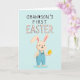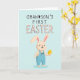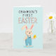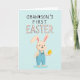 This card features a pale blue background with faint horizontal lines, setting a calm springtime scene 🌷. Near the top, the phrase “Grandson’s First” appears in small, hand-drawn black lettering, with “Easter” placed just below in larger pink outlined letters. Under the text stands a sweet bunny character 🐰 with creamy beige fur, long upright ears shaded pink inside, and a simple face with dot eyes and a tiny smile that feels gently affectionate. The bunny wears light blue overalls, and a small black bow sits neatly on the bib like a thoughtful little touch. In one paw, it holds a golden-yellow egg decorated with soft horizontal bands, as if it’s being offered like a friendly gift. The colors stay in soft blues, warm pinks, and sunny yellow, giving the scene a tender, close-knit look without any clutter. The bunny’s overalls are a light sky blue, and the egg’s stripes curve evenly across its surface against the robin’s-egg blue backdrop.