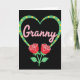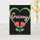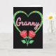 This card features the word “Granny” in soft pink lettering at the center. A lime-green heart outline surrounds the word, and the heart is dotted with small yellow-orange circles that look like little lights. Under the heart, two red roses sit side by side, each with green stems and a thin white outline that helps them stand out. Everything rests on a deep black background, which makes the pink, green, and red colors pop. The simple layout keeps your focus on love and appreciation, like a sweet thank-you meant just for her. It feels meaningful because it pairs a clear name with classic roses, so your message comes across with no fuss 🥰.