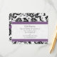 Royal Black Damask Wedding RSVP Response Cards Shown with the beautiful paper color showing which is felt - you choose background color from almost 200 colors and papers which alter the colors so click on customize and create your one of a kind invitation! shown with coral and lilac fonts - you choose colors in fonts as well - if you would like a glossy finish (glossy on front side only) order the basic, linen or metallic papers - for a matte finish order recycled, felt or speckled.