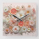 Delicate blossoms and sliced grapefruits are artfully arranged on a soft, light pink background with floating pearls