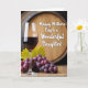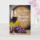 Designed with a cozy still-life scene, the image places a tall wine glass in the left foreground, half-filled with deep ruby-red wine that catches a soft glint of light. Tucked close to the stem is a generous cluster of purple-red grapes with a lightly frosted look, as if just brought in from the vine, and the grouping feels like it was set down for a quiet toast between loved ones ❤️. Yellow-green vine leaves fan out nearby, adding fresh contrast against the warm, softly gleaming wooden tabletop and its visible grain. In the background, a large rounded wooden barrel sits in a gentle blur, giving the setting a rustic, intimate mood like a shared evening in a cellar. On the right side, a flowing white script message reads, “Happy Mother’s Day to a Wonderful Daughter!” with the bright lettering standing out against the darker, earthy tones. The words sit mostly in the upper-right area and trail downward slightly, balancing the weight of the glass and fruit on the left. A faint highlight runs along the rim of the glass while the barrel’s curved edge is softly outlined behind it 🌼.