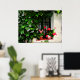 Cool, green grapevines cascade around an ornate window with pink and red potted geraniums providing contrast.