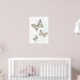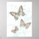 Beautiful graphic art butterflies and floral swirl poster in white, aqua teal, cream, pink and brown. Three inked butterflies, swallowtail, painted lady and a fritillary. Original design and butterfly ink sketches by Sarah Trett.