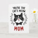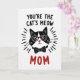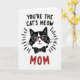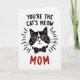 This card features a stylized cat’s head centered on a white background, drawn with simple black shapes and smooth lines that feel friendly and a little flirty. The cat looks straight ahead through rectangular glasses, giving it a smart, affectionate presence, and a polka-dotted bow tie sits neatly under its chin like it dressed up for someone special. A bright red, heart-shaped nose adds a sweet touch ❤️, standing out against the black-and-white design. Short black rays spread outward from around the head, like little bursts of attention that make the character seem adored. Near the top, the phrase “YOU’RE THE CAT’S MEOW” appears in uppercase black lettering, spaced clearly above the illustration. Near the bottom, “MOM” is written in solid red to match the nose, anchoring the layout with a warm pop of color 🌼. The white space stays open and uncluttered, with the black rays circling the cat’s head like a gentle halo of lines.