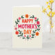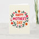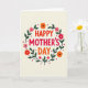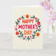 Designed with a creamy off-white background, this Mother’s Day card centers on the stacked message “HAPPY MOTHER’S DAY” in large, friendly letters. “HAPPY” appears at the top in bright red, “MOTHER’S” sits beneath it in a deeper crimson, and “DAY” finishes the phrase in warm orange, drawing the eye inward like a hug ❤️. Encircling the text is a rounded wreath of flowers and greenery that feels like it’s gently gathered around the words. The blossoms range from soft pink to fiery orange and rich red, each with a small dark center that adds depth, while dark green leaves and thin stems weave between them in an easy, affectionate rhythm. Small five-pointed stars in crimson are sprinkled through the wreath like little sparks, giving a friendly, celebratory touch 🌼. The layout keeps the text centered and the wreath evenly spaced, so the colors feel balanced without crowding the message. The wreath shows layered petals, dark-centered blooms, and slender green stems looping in a neat circle around the lettering.