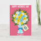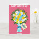 This greeting card features a stylized bouquet centered on a hot pink background, with bright white, sunny yellow, and soft sky-blue flowers arranged closely together like a shared embrace ❤️. Deep green leaves peek out around the blooms, adding contrast and a cozy, tucked-in feeling. The bouquet is wrapped in a sleeve with vertical white and light blue stripes, tied neatly with a royal blue bow that feels like a thoughtful gesture between close friends. A pale yellow tag hangs from the wrap at a slight angle, carrying a short affectionate note in darker blue lettering. Across the top, large white text announces the Mother’s Day occasion, standing out clearly against the pink. Near the bottom, a smaller flowing line of text appears in a lighter tone, adding a gentle, caring touch 🌼. The overall look is graphic and layered, with cutout-style shapes and crisp edges on each petal, leaf, and ribbon. The pale yellow tag sits just right of center beneath the bow, tilted slightly, with its darker blue message clearly visible.