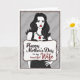 This greeting card features a stylish 👩 at the center, drawn in a graphic, comic-like illustration with a confident stance and one hand resting at her hip. Her dark hair falls around a detailed face with red lips and direct, inviting eyes that feel like they’re meeting a partner’s gaze. A beaded necklace circles her neck, ending in a round red pendant that echoes the warmth of a small ❤️ tucked into the design. She wears a fitted gown shaded in black and grey, dotted with fine speckles that add depth and a soft shimmer effect. Across her midsection sits a curved, ornamental banner carrying the message “Happy Mother’s Day to my beautiful Wife,” placed prominently so it reads first. The lettering appears in flowing, decorative lettering, with rich brown for most of the words and deep red used to highlight key parts, tying back to the pendant and lips. Behind her is a light grey patterned backdrop with a decorative border framing the entire scene.