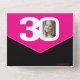 Bold simple graphic bright hot pink, black and white photo template all-in-one 30th birthday invitation. Personalize this detachable milestone birthday invitation with your own birthday party event details, and up to four different photos of your birthday girl. Invite comes with a simple RSVP detachable reply card where you can also request a song to dance to or ask for any dietary or special requirements if required. Simple three photo circles for your now and then photos and space for your own photo in the 0 of 30 on the outside flap that is up to 4 different photos for you to add. Other colors and matching items are available. © Original design by Sarah Trett for www.mylittleeden.com on Zazzle.