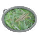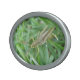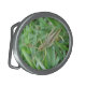 This awesome belt buckle features a detailed macro photograph of a small green grasshopper with brown mottled markings sitting on the grass. In the photograph you can see the detail of the jointed legs, long antennae and black and gold eyes of the grasshopper.