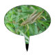 This awesome cake decoration features a detailed macro photograph of a small green grasshopper with brown mottled markings sitting on the grass. In the photograph you can see the detail of the jointed legs, long antennae and black and gold eyes of the grasshopper.