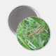 This brilliant magnet features a detailed macro photograph of a small green grasshopper with brown mottled markings sitting on the grass. In the photograph you can see the detail of the jointed legs, long antennae and black and gold eyes of the grasshopper.