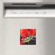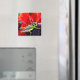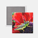 This brilliantly colored magnet features a shiny green, yellow and black grasshopper perched on the purple center of a flower with gorgeous red petals.