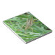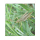 This awesome notepad features a detailed macro photograph of a small green grasshopper with brown mottled markings sitting on the grass. In the photograph you can see the detail of the jointed legs, long antennae and black and gold eyes of the grasshopper.
