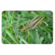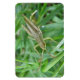 This awesome magnet features a detailed macro photograph of a small green grasshopper with brown mottled markings sitting on the grass. In the photograph you can see the detail of the jointed legs, long antennae and black and gold eyes of the grasshopper.