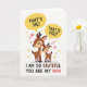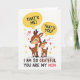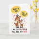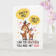 This card shows two stylized deer-like characters standing close together on a white background, with their eyes gently closed and small smiles that suggest a tender bond ❤️. The larger figure and the smaller spotted one are shaded in warm browns with creamy undersides, and both have simple dark antlers and a soft pink blush on their cheeks. Above their heads, two sunshine-yellow speech bubbles float, one reading “THAT’S ME!” and the other “THAT’S YOU!”, creating a sweet back-and-forth like an inside joke between loved ones. Around them, scattered yellow dots and several pink hearts add a cozy, affectionate mood without crowding the space 🌼. Along the bottom, a clear sans-serif message reads “I AM SO GRATEFUL YOU ARE MY MOM,” with the word “MOM” in coral pink to stand out. The layout keeps plenty of open white space so the characters and the message feel close and focused, like a quiet hug captured in a simple scene. Pink hearts and yellow circles drift around the pair while the two yellow speech bubbles hover above them.
