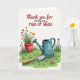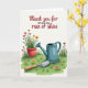 Designed with a gentle mix of typography and garden imagery, this card opens on a white background that lets every color stand out. Across the upper third, a short message sits centered in a flowing letter style, set in a dark ink that reads clearly. Below the words, a cozy garden scene suggests steady care, like the kind shown between close friends or sweethearts ❤️. A terracotta-colored flowerpot takes center stage, packed with leafy greens and blossoms in red, warm orange, and sunny yellow 🌼. To one side, a teal watering can rests on rolling green grass, angled as if it was just used moments ago. Nearby, a small hand trowel lies on the ground with a silver metal blade and a smooth wooden handle. The pot, watering can, and trowel are arranged in a calm triangle, with the brightest flowers clustered near the top of the plant and the grass forming a soft base underneath.