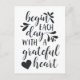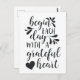 Spread an attitude of gratitude. Our handwritten typography postcard design features the quote "begin each day with a grateful heart" in soft off-black hand lettered calligraphy script adorned with swashes and a heart illustration.