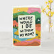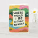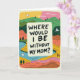 On the front of the card a soft, rounded rectangular panel holds the main message, giving the design a gentle, close-to-the-heart feel ❤️. The question “WHERE WOULD I BE WITHOUT MY MOM?” sits centered inside the panel in thick, friendly lettering that feels like it was written with care. Around it, layered hills roll outward in cheerful greens, yellows, oranges, and pinks, suggesting a warm embrace between parent and child. A calm blue river curves through the lower area, drawn with simple strokes that guide your eye like a quiet walk together. Small evergreen trees are scattered across the slopes, and a few white birds glide overhead, adding a tender sense of companionship 🌼. Above the landscape, the sky fades from yellow into pink, like early morning or late evening when conversations feel softer. A subtle cream-colored border frames the whole scene, with the bright landscape tucked neatly inside it.