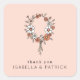 This wedding sticker features a charming floral wreath design on a soft peach background, creating a warm and inviting atmosphere. The wreath is composed of delicate white flowers with orange centers, accented by slender greenish-gray leaves, arranged in a symmetrical circular pattern. Below the wreath, elegant sans-serif typography reads "thank you" followed by names in a bolder style, adding a personal touch to this celebration-themed sticker. Perfect for expressing gratitude at weddings or special events, its whimsical and vintage-inspired aesthetic evokes feelings of nature and simplicity.