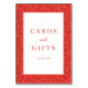 This wedding tabletop sign features a sophisticated design with a central white rectangle framed by intricate, swirling red patterns. The text "CARDS and GIFTS" is elegantly displayed in a mix of serif and cursive fonts, followed by "THANK YOU" in smaller letters, creating a classic yet modern look. The deep red color palette adds warmth and sophistication, making it perfect for expressing gratitude at your special event. Its balanced composition and stylish typography ensure it stands out beautifully on the reception table.