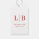 This wedding favor tag features a minimalist design with a clean, centered layout on a white background. The bold red letters "L | B" are prominently displayed in a sophisticated serif font, conveying elegance and formality. Below, the words "THANK YOU" express gratitude, while the overall simplicity and symmetry create a modern and refined aesthetic. Perfect for adding a touch of class to your special day, this tag is ideal for celebrating love and appreciation.