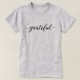 The t-shirt features the word "grateful" written in an elegant and modern script type, making a simple yet powerful statement. The black typography stands out against the fabric, creating a look that is both stylish and meaningful. This design is ideal for those who wish to showcase their gratitude and carry a message of positivity wherever they go.