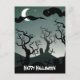 Clouds and the crescent moon over a cemetery and spooky trees.