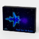 A simple, blue-toned 3D fractal image resembling a stylized spaceship superimposed on a starry background. Concentric rings (gravity waves?) emanate from the spacecraft into the seemingly empty vacuum of space. A light blue aura surrounds the spacecraft, perhaps the result faster-than-light travel. Add your own text.