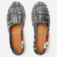 Espadrilles slip-on shoes with a gray tribal abstract all-over print pattern. A zigzag of gray and shades of white going in different abstract directions. This design contains an all-over patterned art. The design area is in the form of a pattern, and of abstract art that covers the entire design area.