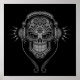 This elaborate DJ sugar skull design by artist Jeff Bartels is decorated with intricate swirls and dot patterns. Headphones sit on top of the skull with two wires hanging below. A shadow falls onto the circular mesh background making it look like the skull is floating just above the surface. This aggressive Day of the Dead inspired image is perfect for musicians and music lovers.