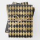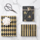 Vintage Paris gray and gold pattern wrapping paper in three different styles featuring harlequin, stripes, and roses.