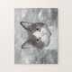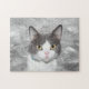 Gray and white tuxedo kitty cat face on an abstract gray and white background for an extra challenge jigsaw puzzle