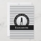 This custom design features a female golfer silhouette set on a realistic golf ball image. The golf ball is placed on a black circle that is bordered with curved text "GOLF GOLF GOLF GOLF" in white font. A black band holds a template for a monogrammed name or custom text. The background is a trendy ultimate gray and white stripe pattern. Blank on back, this card is perfect for your personal handwritten note.