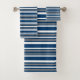 These contemporary bath towels feature a pattern of blue, gray and white stripes.