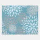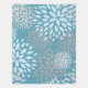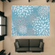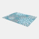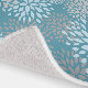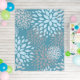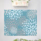 A modern abstract floral pattern area rug in blue, gray and teal.