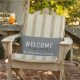 Modern rustic dark gray faux burlap Welcome to our Porch Family monogram name outdoor pillow.