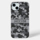 Customize this gray camouflage iPhone 15 plus case with your name in a trendy modern CAP font in dark gray on light gray. It's masculine and perfect for your favorite military, hunting, country or outdoorsman!