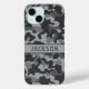 Customize this gray camouflage iPhone 15 case with your name in a trendy modern CAP font in dark gray on light gray. It's masculine and perfect for your favorite military, hunting, country or outdoorsman!