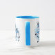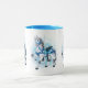 I have loved carousels since I was a child. The beautiful designs of the animals and music from carousels set up at fairs and parks hold a special place in my heart. This inspired me to draw some carousel horses of my own, then color them with acrylic ink. The watercolor of a gray horse decorated in blue featured on this mug is one of the results.