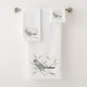 This bird art towel set design is from my original watercolor painting of a Gray Catbird perching on a branch, surrounded by foliage in sage green - set on a customizable solid color background.
