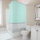 Stylish cloth shower curtain done in a mint green with tiny white polka dots and a gray and white chevron pattern, across the bottom. Matching bathroom accessories are available.