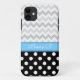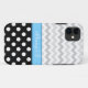 Stylish & sophisticated iPhone 5 case designed with a white polka dots over black pattern on the bottom, a 2-tone gray chevron zigzag pattern on the top, and personalized with your name or custom text in a white script font over a blue stripe.
