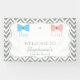 Gray chevron gender reveal banner. The design features a gray and white chevron pattern and a white circle in the middle with a pink bow and a blue bow tie and your custom text.