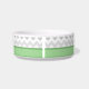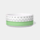 Stylish and trendy cat bowl with a 2-tone gray and white chevron zigzag pattern, and personalized with your feline's name or other custom text in white over green.